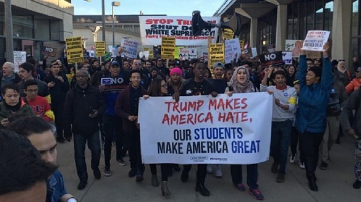 “Fuck Donald Trump, because we were so close to having our first ever woman president and we have a guy that is a White Nationalist and he’s currently leading in the polls and in winning and it’s just disgusting to me and I’ve seen this happen with Brexit and I’ve seen this happen around the world and it’s just so saddening to me that this could possibly happen to our nation.” Said a frustrated protester called Dina.
