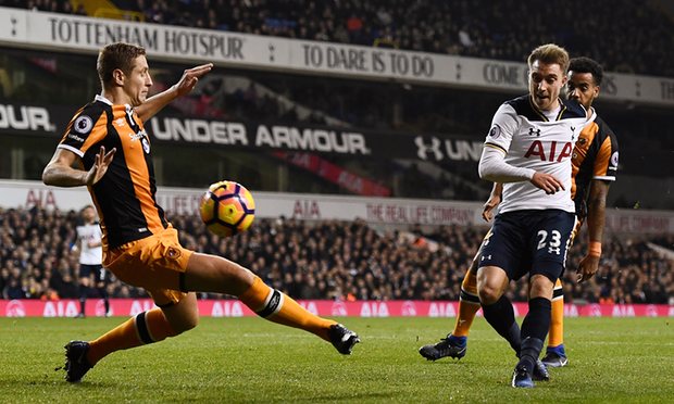 Ten minutes later, Eriksen came within inches of a hat trick as his free kick was tipped onto the post by Hull goalkeeper David Marshall, but Victor Wanyama was on hand to convert the rebound.
