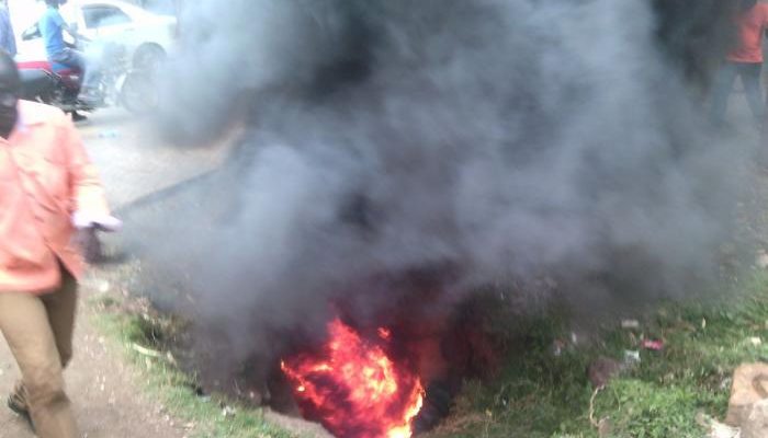 The angry residents pulled down the banner bearing the Jubilee ‘Tuko Pamoja‘ slogan from a billboard and set it ablaze.