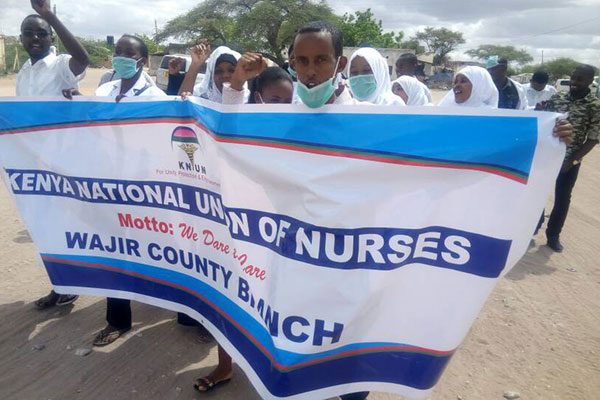 Similar street protests were witnessed in Kisumu and Wajir town, with the health caregivers demanding full implementation of their pact.