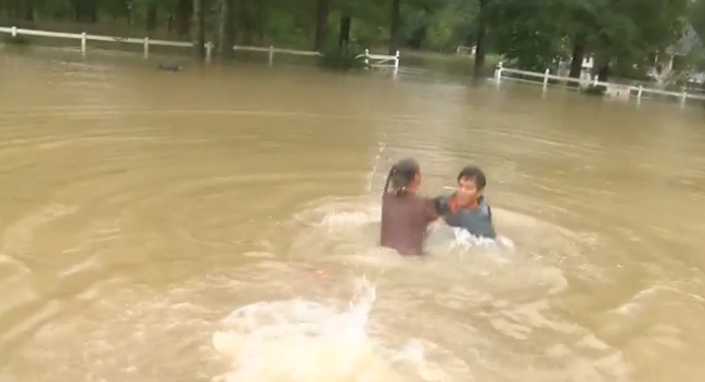 The dramatic and highly dangerous rescue was captured in a video that shows the moment three men pull up in a boat to save the woman from drowning in the Baton Rouge floods.