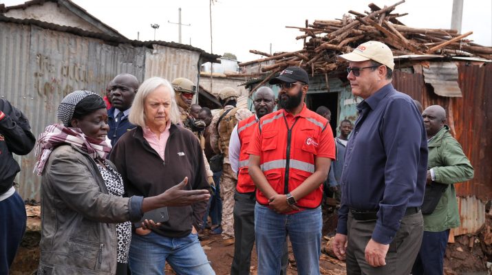 They toured Mradi, Mathare 4A, where residents were hardest hit by the recent flooding, before visiting one of the evacuation centers set up by Kenya Red Cross, which is currently accommodating 252 families.
