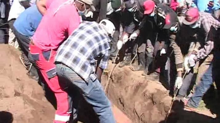 Relatives of 21-year-old Paul Gicheche who was mistakenly buried in the father’s farm watched from a distance as the exercise was carried out.